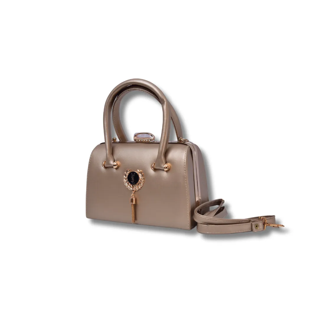 This stylish handbag has a smooth and shiny finish with a modern, elegant design. It features two sturdy handles for easy carrying and a decorative emblem in the center with a hanging charm. The bag has a structured shape, making it perfect for both daily use and special occasions. Its compact size offers enough space to carry your essentials while keeping your look chic and polished.