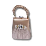 This elegant handbag has a unique shape and a soft, gathered fabric design on the front. It features a beautiful decoration made of shiny stones and flowers, adding a touch of sparkle. The handle is wrapped in a stylish, ruched material, and the top has a decorative clasp with a pearl-like detail. Perfect for formal events or special occasions, this bag combines beauty and charm in a compact size.